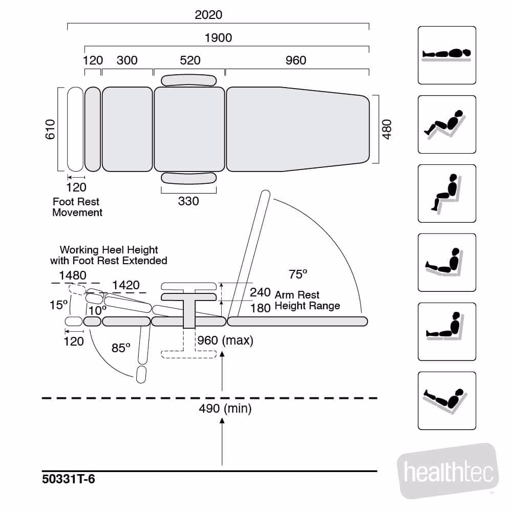 Ideal for Podiatrists that have to share their space with other practitioners. Manual adjusting back and legs rests and adjustable arm rests combines the convenience of a chair with the treatment table.